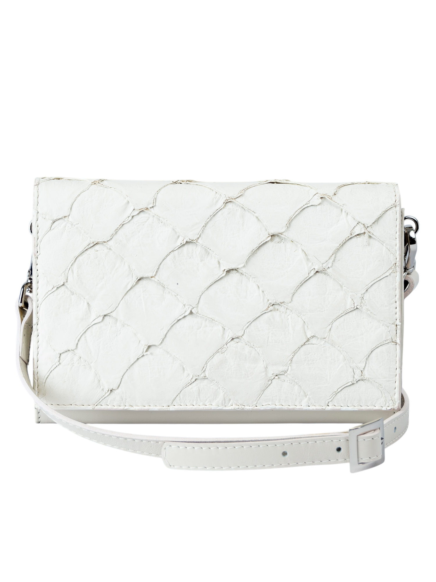 Bolsa de couro de pirarucu certificado feita no Brasil.
