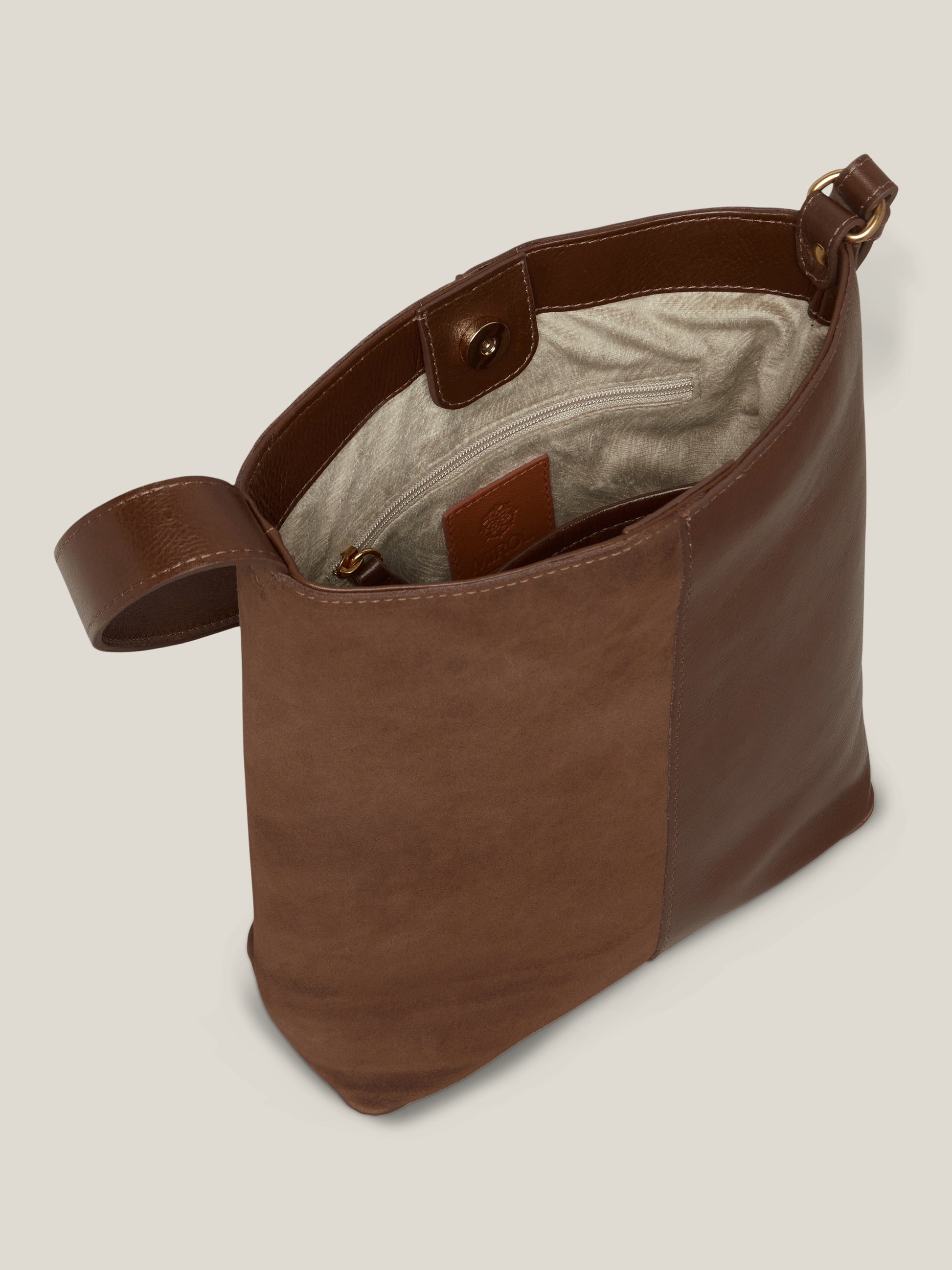 Bolsa de couro legítimo e camurça feita no Brasil.