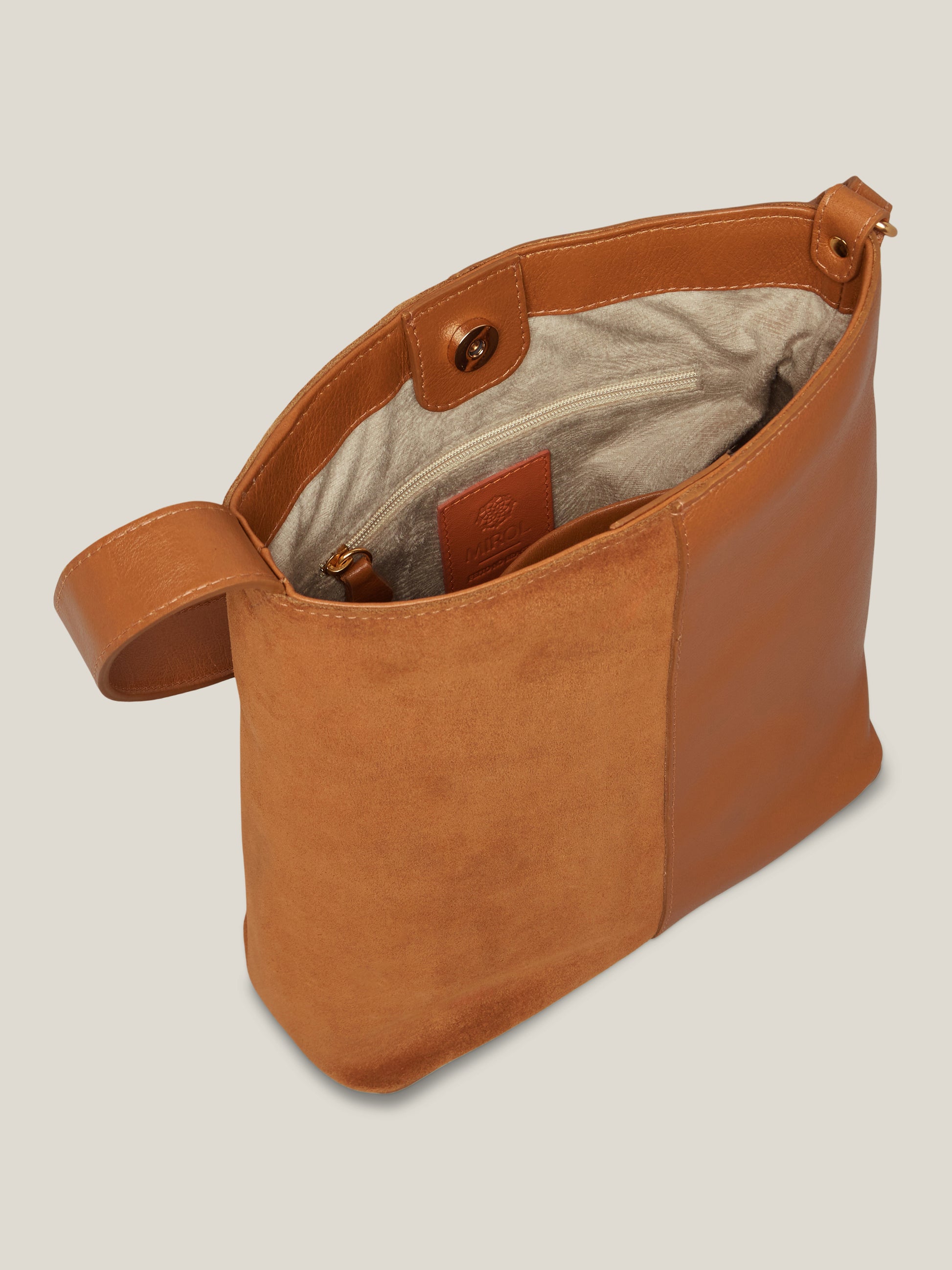 Bolsa de couro legítimo e camurça feita no Brasil.