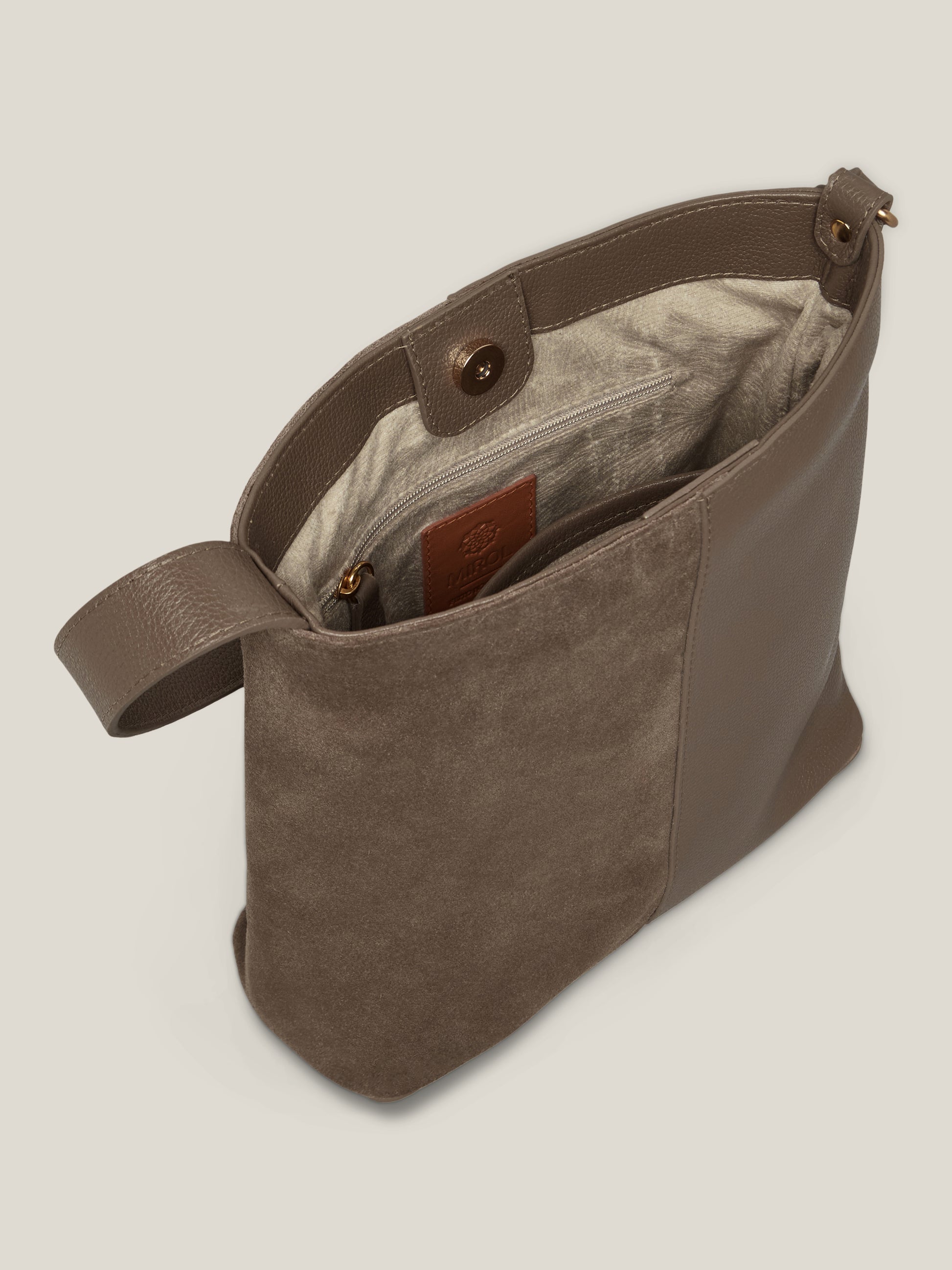 Bolsa de couro legítimo e camurça feita no Brasil.