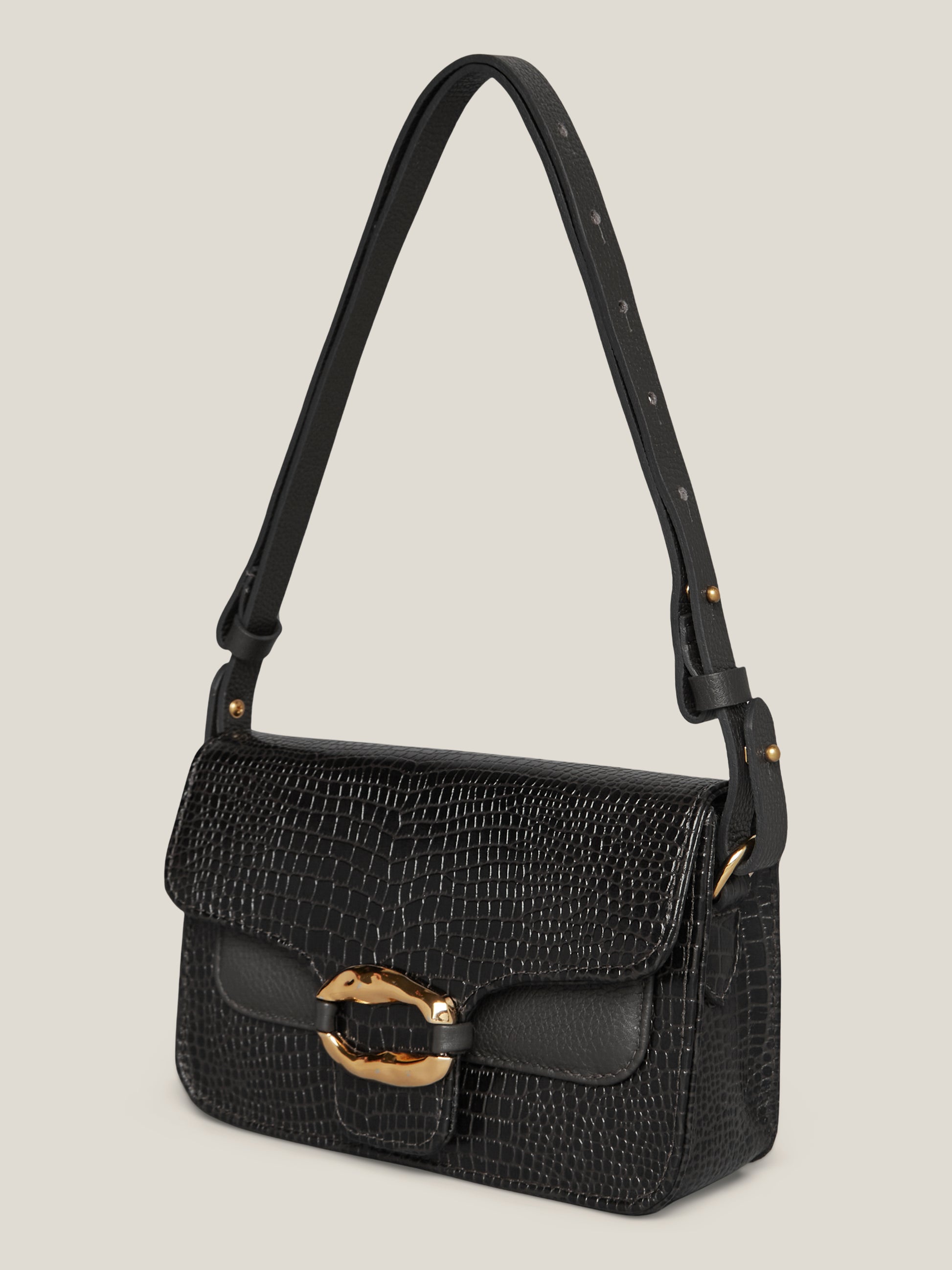 - Diferencial de design: textura croco sofisticada e peça de metal no banho ouro com formato orgânico, que traz personalidade e elegância em cada detalhe.