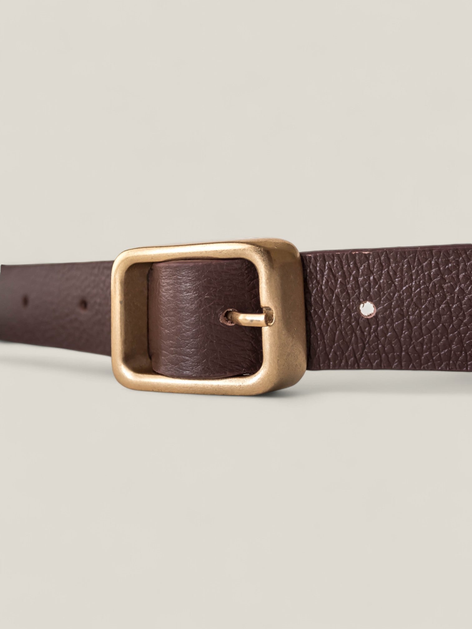 - Design versátil e atemporal: A fivela metálica com trapezoidal no banho ouro light escovado adiciona um toque de estilo sofisticado e discreto.